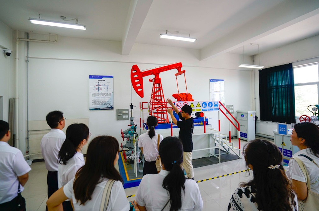 2021年7月8日下午,中共陜西省水工環地質調查中心第二、八黨支部和地熱所部分同志赴西安石油大學工程訓練中心(陜西省石油石化虛擬仿真實驗教學中心)觀摩學習。黨員同志們在學校趙老師的悉心講解下,先后參觀了地質實訓室、鉆井實訓室、采油實訓室、油氣集輸實訓室,并同講解老師進行專業方面的友好交流。在地質實訓室,同志們仔細觀看巖礦和化石標本,了解油氣儲層和油氣藏靜態地質特征與油氣田開發動態響應的內在聯系。在鉆井實訓室,同志們先是通過模型鉆機了解鉆井的設備和功能,隨后通過司鉆模擬器,觀摩完整的起下鉆過程,對于鉆井的作業有了直觀的認識。觀看教學動畫,學習了鉆機頂驅等新設備。在采油實訓室,學習游梁式、鏈條式、離心式、螺桿式抽油機的原理。在油氣集輸實訓室,同志們通過集輸流程沙盤,詳細了解油氣集輸的全部流程,特別是原油的伴熱集輸流程,該流程主要是通過換熱器將集輸管線中的原油進行加熱,降低原油粘度,保障原油冬季集輸順利。